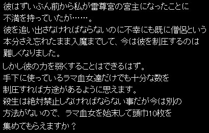いっつも思うんだけどクエ全般の文章ってなんか読みにくいってか無理やり日本語に訳したんだぜコンチキショーに思えるのは私だけ(´・ω・`)